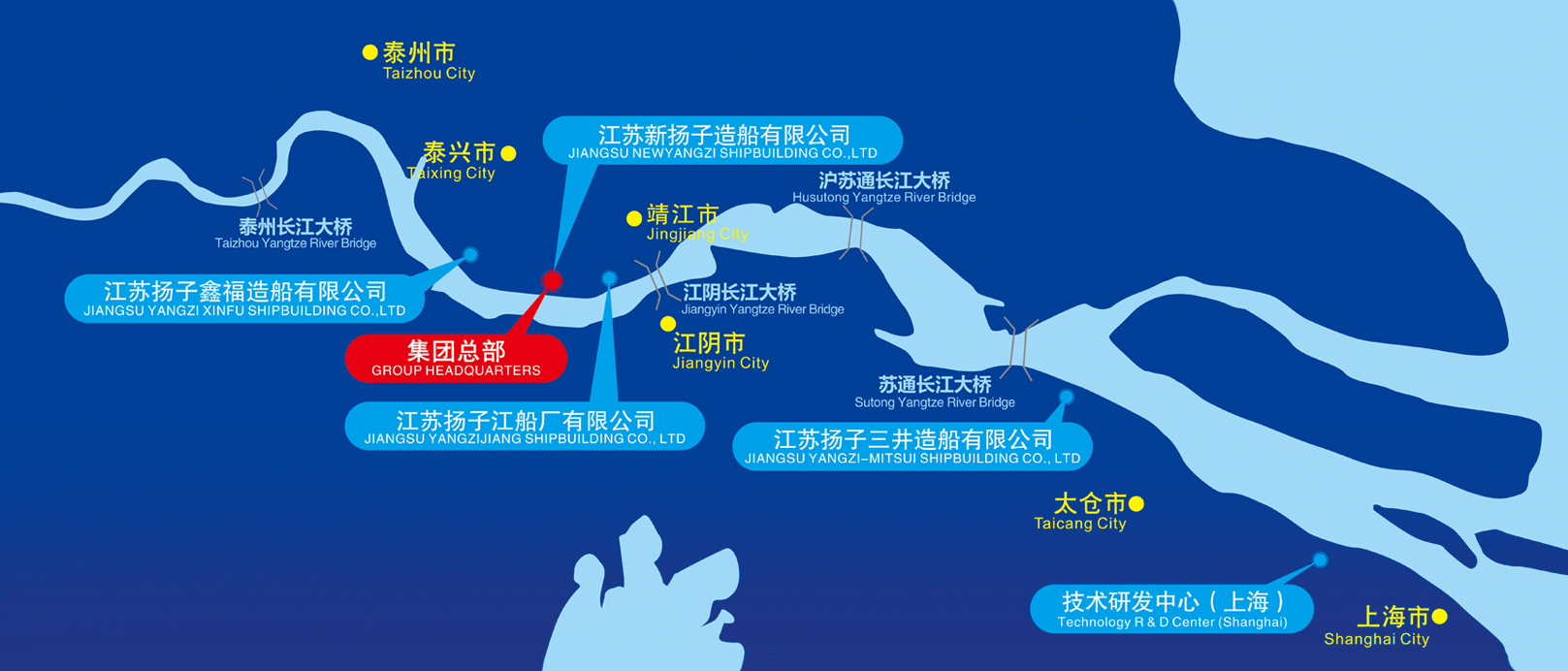 集團(tuán)公司下轄江蘇新?lián)P子造船有限公司、江蘇揚子鑫福造船有限公司、江蘇揚子三井造船有限公司及江蘇揚子江船廠有限公司4家造船企業(yè),分布于長江下游江蘇省境內(nèi)的靖江市、泰興市和太倉市的黃金水道兩岸,距上海、南京兩大城市均170公里。