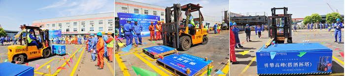 啟動儀式后,來自新?lián)P子造船9個車間/部門舉薦的18名叉車工參加了首場技能競賽。叉車工競賽項目為勇闖四關(guān)。四關(guān)是指實干篤行(過S彎道)、強基固本(巧碼貨盤)、專業(yè)精進(寬物進窄門)、勇攀高峰(搭酒杯塔),項目是對參賽選手綜合能力的考驗,要求做到“快、巧、準、穩(wěn)”,即快速通過障礙、叉運寬物進窄門、精準堆放貨盤、平穩(wěn)搭建杯塔。