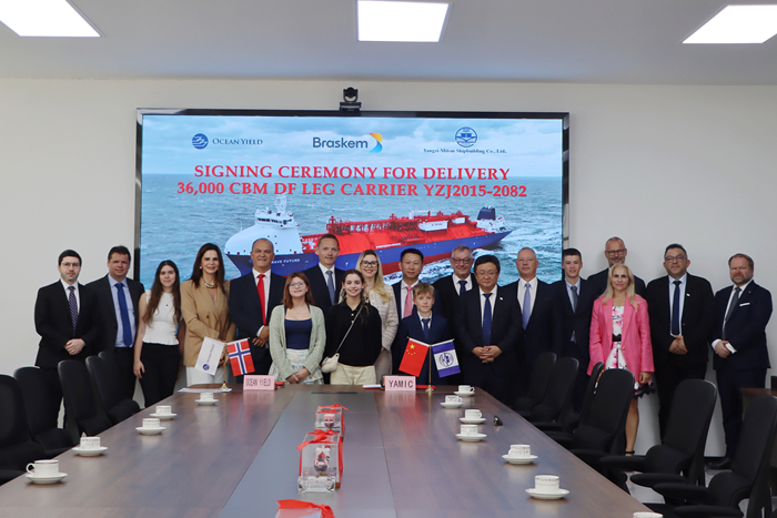 7月9日,Ocean Yield COO Andreas Reklev先生及我集團(tuán)副總經(jīng)理兼揚(yáng)子三井總經(jīng)理宋書(shū)明先生代表雙方簽署交船文件。