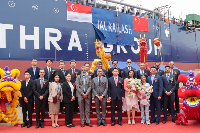 On the morning of May 28, representatives of both parties signed the delivery protocols. On the same day, Yangzi-Mitsui held a grand naming ceremony for the vessel. Godmother Ms. Swati Sharma named the vessel "JAL KAILASH", and then naming sponsor Mr. Sanjay Sharma cut the string and tossed champagne.